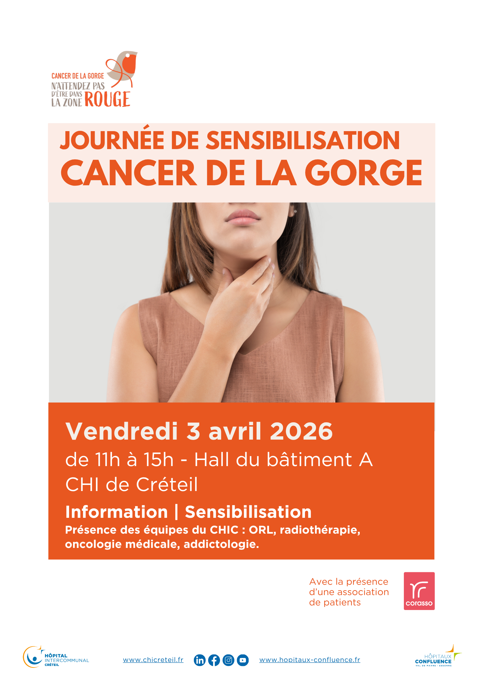 Les équipes ORL, radiothérapie, oncologie médicale et addictologie du CHIC, ainsi que l’association de patients Corasso seront présentes pour informer les usagers, échanger avec eux et répondre à leurs questions.