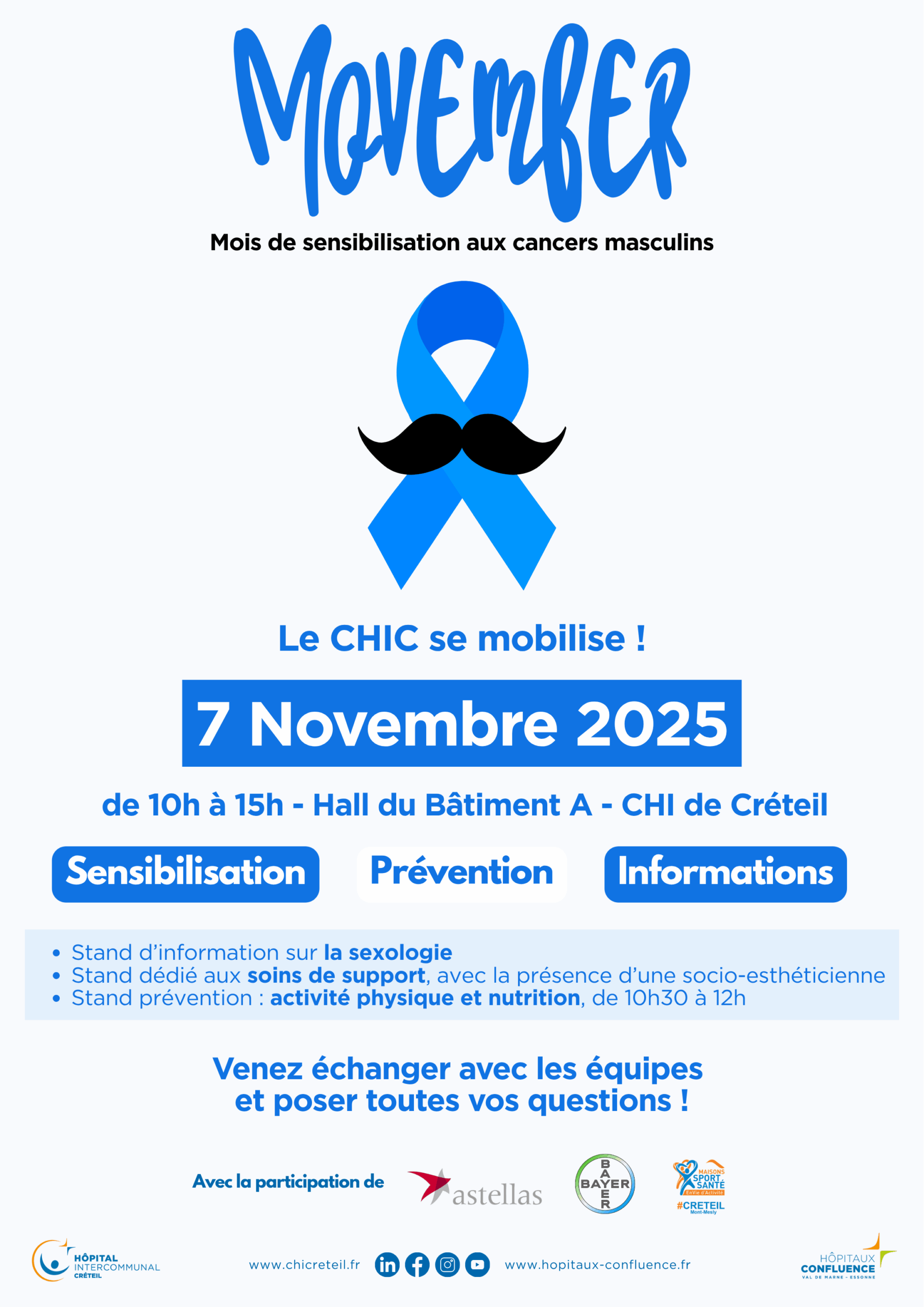 À l’occasion de Movember, mois consacré à la prévention et à la santé masculine, et notamment à la lutte contre le cancer de la prostate et des testicules, une journée de sensibilisation se tiendra : Vendredi 7 novembre 2025 – bâtiment A – de 10h à 15h